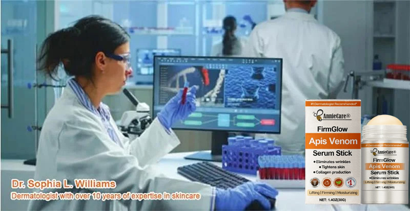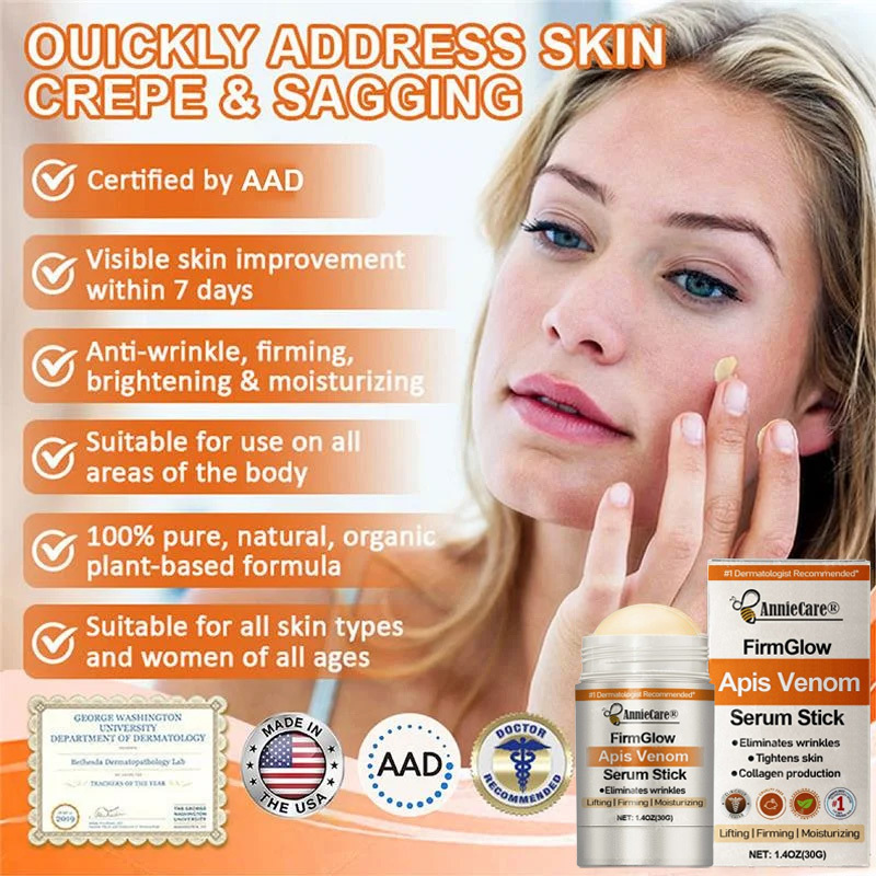 Endorsed by Dr. Sophia L Williams. a board-certified dermatologist with over 10 years of expertise in skincare. AnnieCare® FirmGlow Apis Venom Serum Stick comes highly recommended. This exceptional product provides an ideal remedy for an array of skin issues. including neck lines. sagging arms. drooping breasts. chest discomfort. stretch marks. cellulite on the abdomen. thighs. and buttocks. as well as sagging buttocks. among others. Importantly. it achieves these results without any adverse side effects. Crafted entirely from 100% natural plant extracts. thiscream is suitable for all skin types. including sensitive skin.