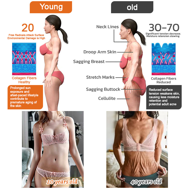 As people get older. their bodies experience the normal effects of aging. This development usually begins in their early twenties. as the production of collagen. which contributes to skin structure. slows down and the elasticity of elastin. responsible for skin resilience. reduces or deteriorates. These effects are particularly noticeable in women. Furthermore. the shedding of dead skin cells may become more sluggish. while the creation of new skin cells may gradually decrease. resulting in the formation of sagging and wrinkles across the body's skin tissue.