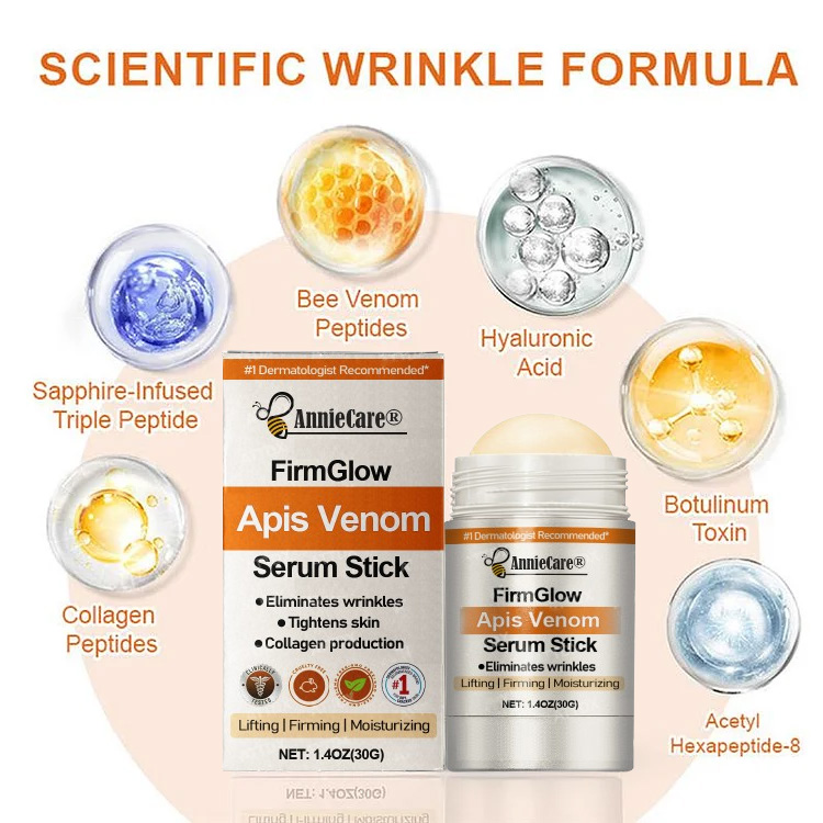 AnnieCare® FirmGlow Apis Venom Serum Stick uses apis venom peptides to mimic the effects of Botox. relaxing facial muscles and reducing the formation of expression lines. At the same time. hyaluronic acid deeply hydrates the skin. making it plump and effectively smoothing fine lines and wrinkles. The combination of Acetyl Hexapeptide-8 and botulinum toxin targets deep wrinkles like forehead lines and crow's feet. leaving your skin looking firmer and smoother.